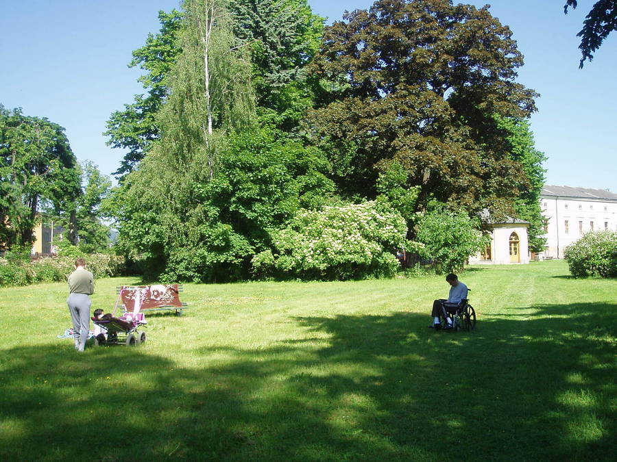 Největší ztrátou byla přestavba zámecké kaple zasvěcené Panně Marii, jejíž trojboký závěr byl oddělen příčkou. V přízemí jižního křídla bylo zrušeno nárožní schodiště a tři místnosti byly spojeny do velké trojlodní jídelny. Na ni navazovala jídelna sester, později šatna personálu a původní šatna se záchody. Severní křídlo doplnily sklady oděvů, opravna a obuvnická dílna, v bývalé garáži a kočárovně vznikla prádelna. V západním křídle byla zřízena kotelna s novým vysokým komínem, který se stal cizorodým prvkem v siluetě zámku a parku.